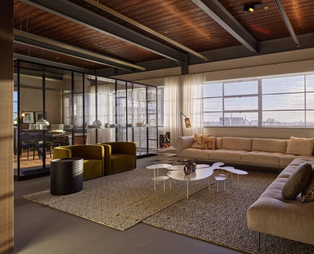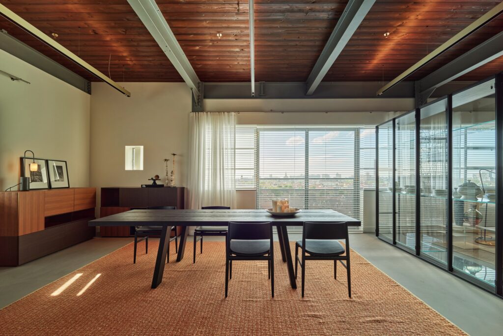 Om de industriële sfeer van het Riffelgebouw te behouden, is gekozen voor een zorgvuldig palet van materialen. Denk aan verfijnde houtsoorten, tactiele stoffen en rustige tinten die warmte toevoegen aan de robuuste basis. Luxe afwerkingen zorgen voor een hedendaags comfortniveau, terwijl het geheel zijn monumentale karakter behoudt.