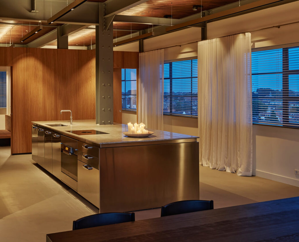 Bij monumentaal wonen in De Meelfabriek begint het ontwerp niet met toevoegen, maar met begrijpen wat er al is. De karakteristieke stalen kolomconstructie, hoge plafonds en industriële schaal vormen het fundament van deze loft. Deze elementen zijn bewust zichtbaar gelaten en vormen het ritme van de ruimte.